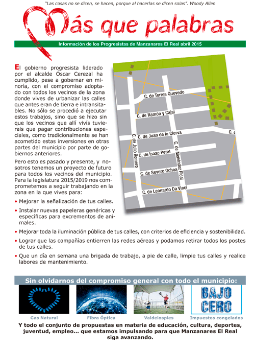 Somos más que palabras. Lo hemos demostrado durante muchos años, en el gobierno y en la oposición, con una labor sensata, progresista y de profundo cambio en nuestro pueblo. Con cada uno de los vecinos y vecinas, en lo colectivo y en lo concreto. Por eso también tenemos propuestas directamente dirigidas a cada sector y/o urbanización de Manzanares El Real.