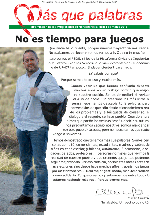 Estamos distribuyendo por todo el pueblo una nueva publicación donde nuestros vecinos podrán conocer algunas de las propuestas principales en las que nos comprometemos a trabajar en la legislatura 2015/2019. Propuestas realistas y necesarias, que vienen a cubrir carencias de nuestro pueblo, de las muchas que paso a paso vamos solventando desde la gestión honesta, eficaz y progresista de nuestro concejales.