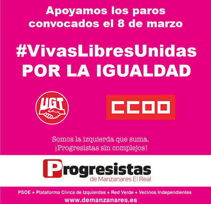 Apoyamos la convocatoria de las centrales sindicales representativas y mayoritarias, CCOO y UGT, de PARO DE 2 HORAS POR TURNO, POR LA IGUALDAD, para el próximo día 8 de marzo de 2018; y por tanto, animamos a trabajadores y trabajadoras vecinas de Manzanares El Real, a sumarse a dicho paro laboral.